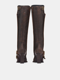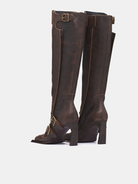 KNWLS boots in brown, biker design, leather construction, full-grain, knee-high, side concealed zip closure, triple pin-buckle strap fastening, signature curved heel, pointed toe, leather sole, leather lining. Made in Italy 100% Cowhide European Sizing