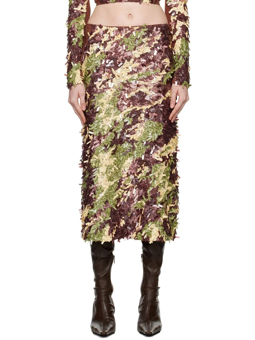 Sequinned stretch nylon mesh skirt. · Elasticized waistband · Hook-eye closure at back · Central vent at back hem · Fully lined Supplier color: Dark camo 95% nylon, 5% spandex. Made in India 242148F092001