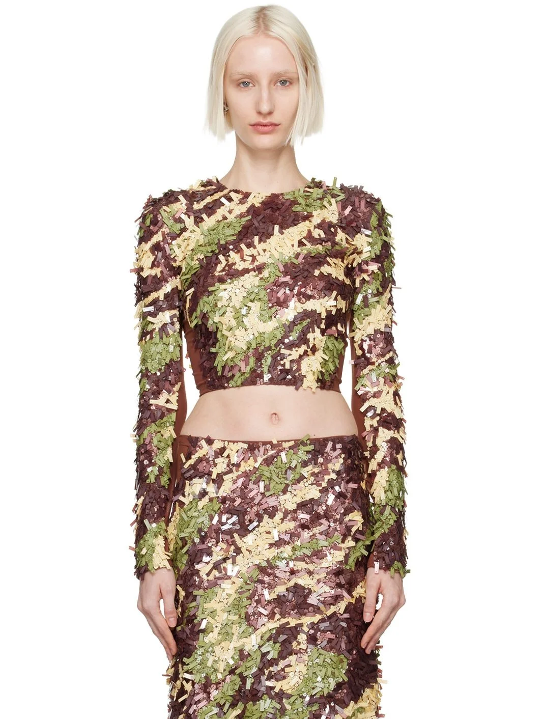 Sequinned stretch nylon mesh top. · Crewneck · Hook-eye closure · Fully lined Supplier color: Dark camo 95% nylon, 5% spandex. Made in India 242148F110001