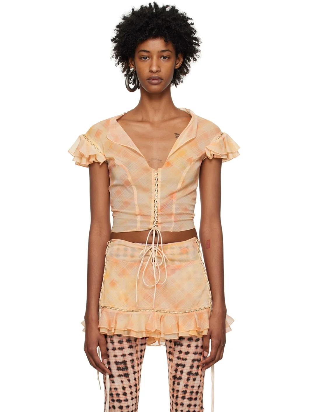 Semi-sheer stretch silk chiffon blouse. Lettuce edges and graphic pattern throughout. · Paneled construction · Plunging V-neck · Lace-up closure · Self-tie lace-up fastening at ruffled cap sleeves Supplier color: Peach bleach 92% silk, 8% elastane. Made in Italy 231148F107033