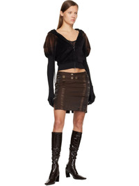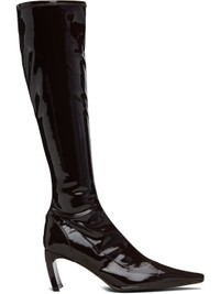 Knee-high patent faux-leather boots. · Pointed toe · Elasticized collar · Zip closure at inner side · Faux-suede lining · Covered curved heel with rubber injection · Faux-leather sole · Heel: H2.75" Supplier color: Espresso Upper: synthetic. Sole: synthetic, rubber. Made in Italy 252148F115000