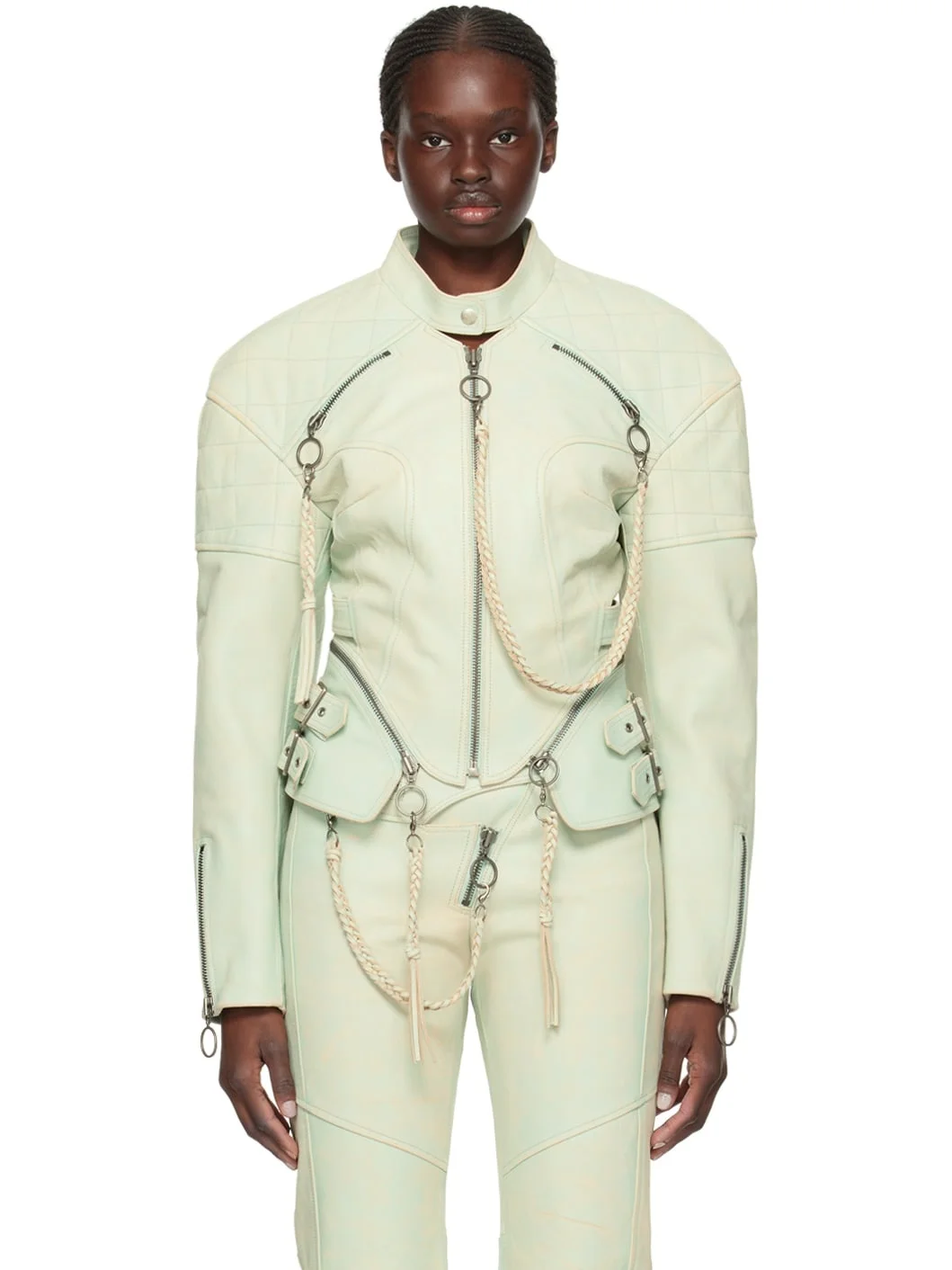 Grained leather jacket. Fading, distressing, and detachable braided tassels throughout. · Paneled construction · Cutout at band collar · Zip closure · Zip pockets · Detachable asymmetric hem for alternate styling · Pin-buckle straps at side seams · Quilted padded shoulders · Zip vent at cuffs · Belt loops and pin-buckle strap at back waist · Full satin lining Available exclusively at SSENSE. Supplier color: Moto teal Body: 100% leather. Lining: 68% acetate, 32% elite. Made in Italy 241148F064004