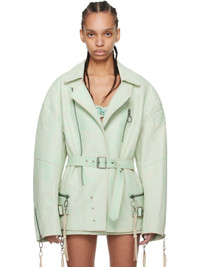 Grained leather jacket. Distressing throughout. · Spread collar · Offset zip closure with partial press-stud placket · Zip and welt pockets · Belt loops and pin-buckle belt at waist · Pin-buckle strap at side seams · Quilted shoulders · Logo embossed at sleeve · Zip vent at cuffs · Full satin lining Available exclusively at SSENSE. Supplier color: Moto teal Body: 100% leather. Lining: 68% acetate, 32% polybutylene terephthalate. Made in Italy 241148F064005