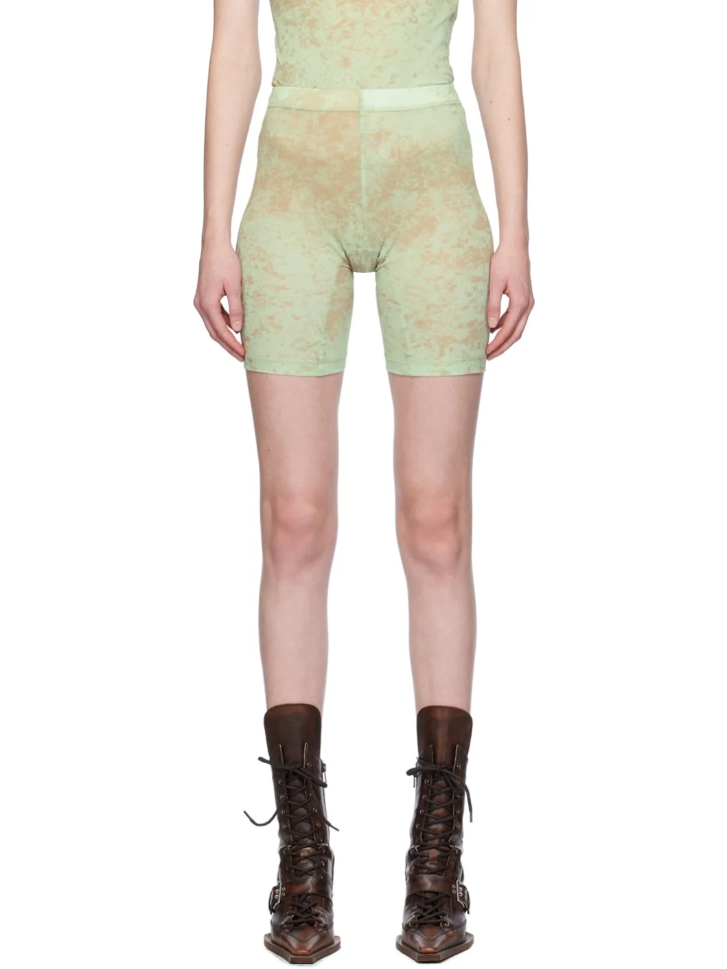 Semi-sheer stretch polyester mesh shorts. Overlock stitching and graphic pattern printed throughout. · Elasticized waistband · Logo graphic printed at back Available exclusively at SSENSE. Supplier color: Teal ink 100% polyester. Made in United Kingdom 241148F088005