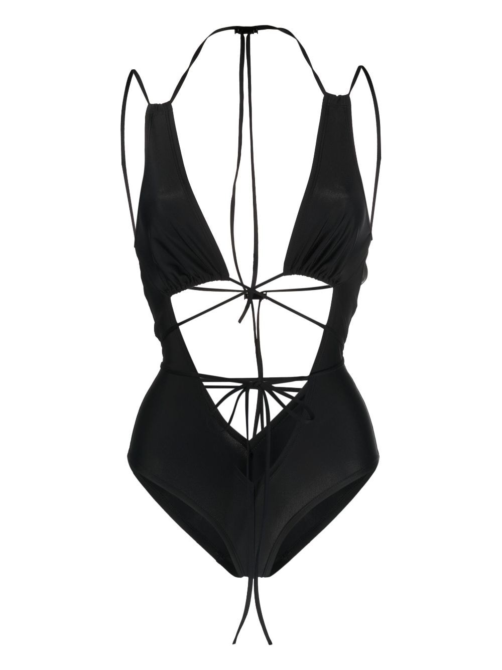 strap-detail one-piece swimsuit KNWLS' creative and contemporary design style is showcased on this on-piece swimsuit through a multi-panel construction and spaghetti-strap detailing across the design. In a monochromatic hue the garment has a simultaneously minimalist feel. Highlights - Black - Multi-panel design - Strap detailing - This item is made from at least 50% recycled or upcycled materials. for recycled synthetic clothing products, we highly recommend using a microfibre-catching washing bag to ensure that no microplastics that can pollute water are released in the process. - Learn more about what makes a product conscious on our conscious criteria page Made in United Kingdom Composition Recycled Nylon 78%, Elastane 22%