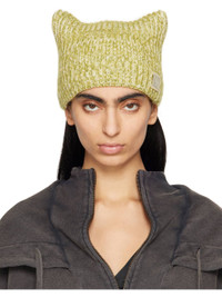 Brushed rib-knit wool-blend beanie in green. · Ears at crown · Rubberized logo patch at face Supplier color: Pale olive 62% wool, 32% polyester, 6% mohair. Made in United Kingdom 251148F014003