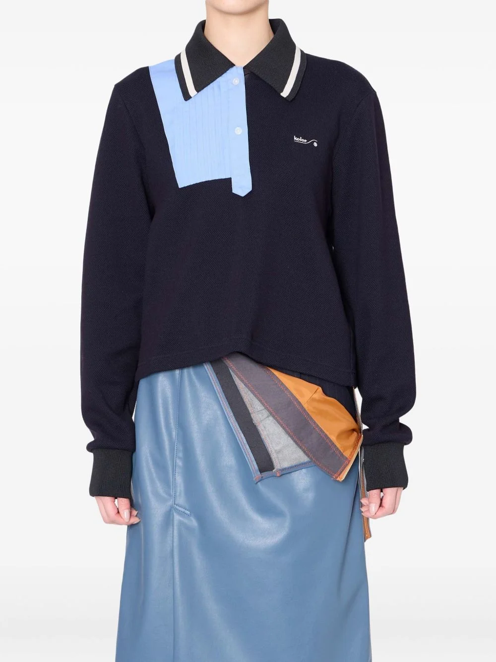 asymmetrical-design polo top Highlights - Navy blue - Long sleeves - Contrasting panel - Pleated panel - Button fastening Imported Composition Polyester 53%, Cotton 47% Washing instructions Read Manufacturer Guidelines