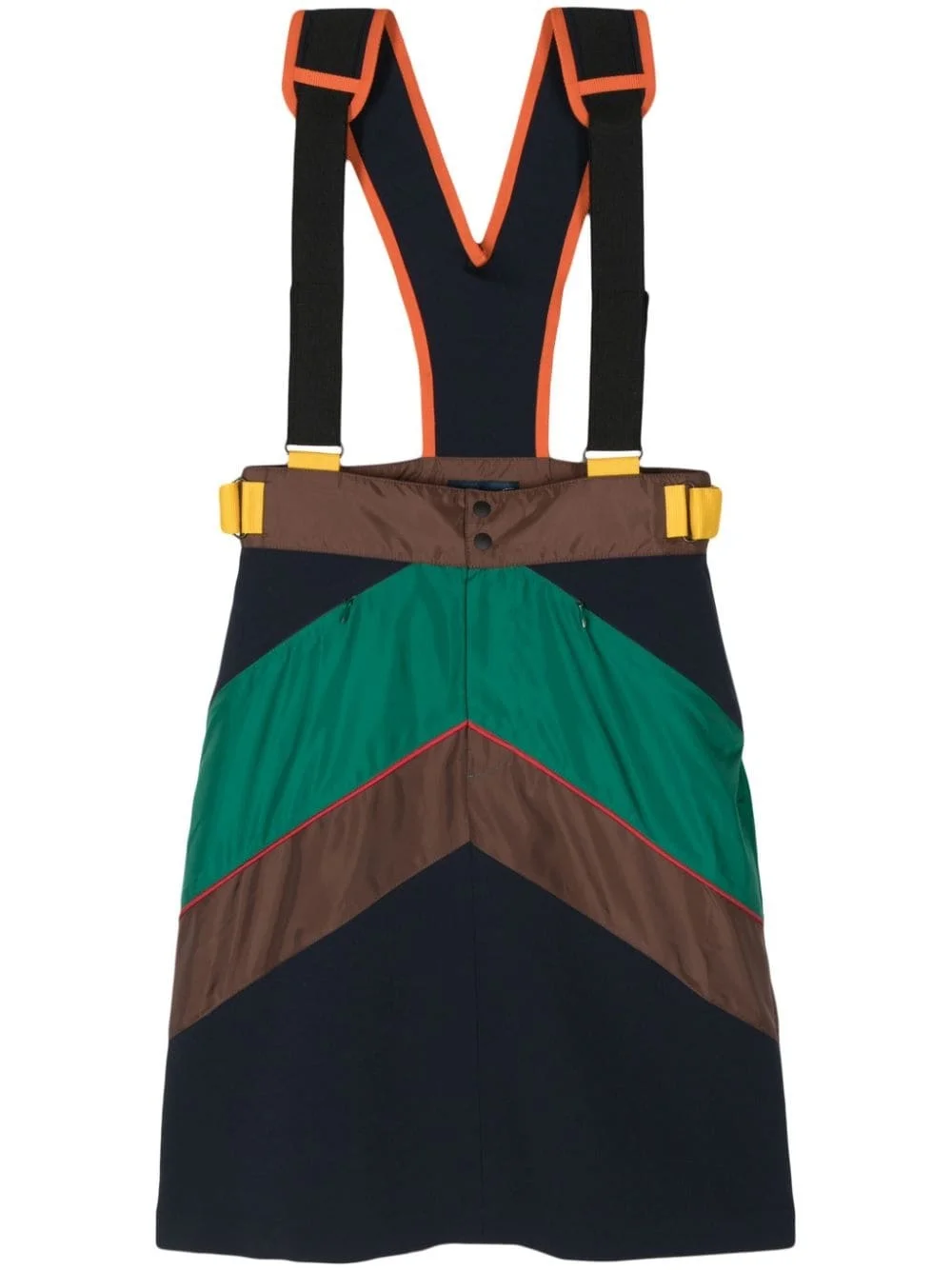 colour-block dungaree dress Highlights - Multicolour - Colour-block design - Adjustable shoulder straps - Front press-stud fastening - Chevron print - A-line - Straight hem - Above-knee length Imported Composition Polyester 100% SIZE & FIT FittingInformation Designed for a slim fit that sits just away from the body offering a close yet comfortable fit The adjustable shoulder straps allow for a preferred fit when worn Made from a midweight non-stretch fabric This piece fits true to size – take your usual size