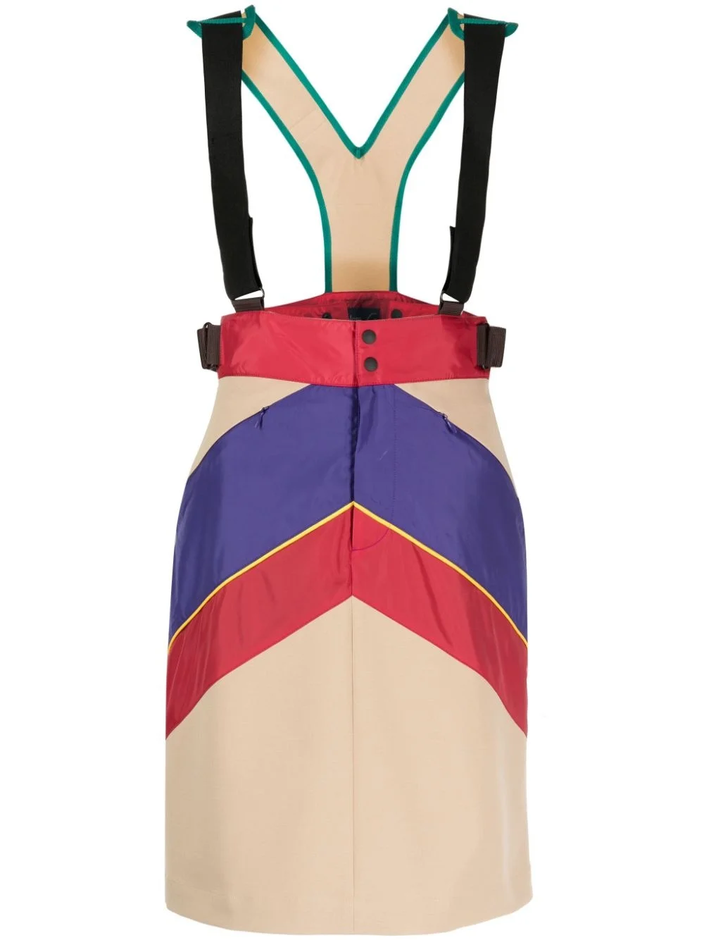 colour-block dungaree dress Highlights - Beige/multicolour - Colour-block design - Adjustable shoulder straps - Front press-stud fastening - Chevron print - A-line - Straight hem - Above-knee length Imported Composition Polyester 100% SIZE & FIT Model measurements Height 5 ft 9 in(1.76 m) Bust/Chest 31.1 in(79 cm) Hips 35.03 in(89 cm) Waist 24.4 in(62 cm) FittingInformation Designed for a slim fit that sits just away from the body offering a close yet comfortable fit The adjustable shoulder straps allow for a preferred fit when worn Made from a midweight non-stretch fabric This piece fits true to size – take your usual size Washing instructions Dry Clean Only