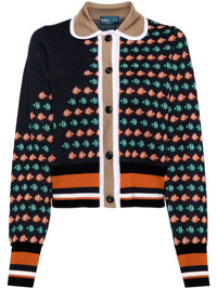 fish-motif intarsia-knit cardigan Highlights - Navy blue/multicolour - Wool blend - Patterned intarsia knit - Peter pan collar - Front button fastening - Long sleeves - Ribbed cuffs and hem Imported Composition Wool 86%, Polyester 14%