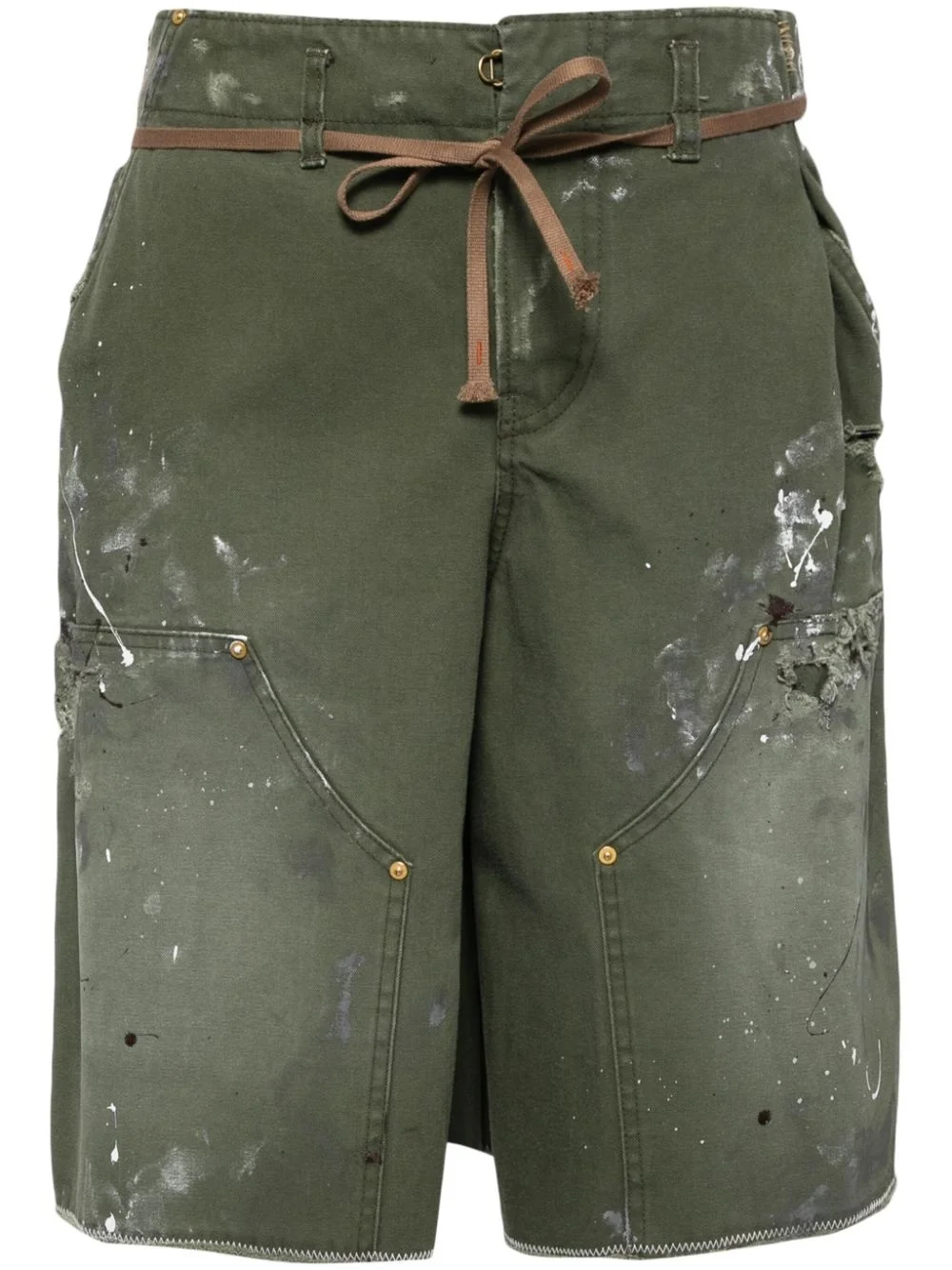 paint-splatter denim shorts Highlights - Olive green - Cotton - Denim - Distressed effect - Paint splatter detail - Mid-rise - Belt loops - Adjustable waist strap - Two side slit pockets - Two rear patch pockets - Wide leg Imported Composition Cotton 100% SIZE & FIT Model measurements Height 5 ft 10 in(1.77 m) Bust/Chest 31.49 in(80 cm) Hips 35.43 in(90 cm) Waist 25.19 in(64 cm) FittingInformation Designed for a loose fit, offering comfort and movement when worn The tie fastening gives an adaptable and personalised fit Sturdy and hard-wearing, this denim piece offers no stretch This piece fits true to size – take your usual size