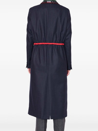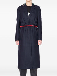 pinstripe beaded-collar single-breasted coat Highlights - Navy blue - Pinstripe pattern - Beaded collar - Belted waist - Long sleeves Imported Composition Wool 93%, Nylon 6%, Fabric 1% Washing instructions Read Manufacturer Guidelines