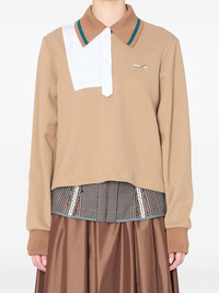 pleated-panel waffle top Highlights - Beige - Waffle texture - Pleated panel - Long sleeves - Polo collar - Contrast tipping Imported Composition Polyester 53%, Cotton 47%