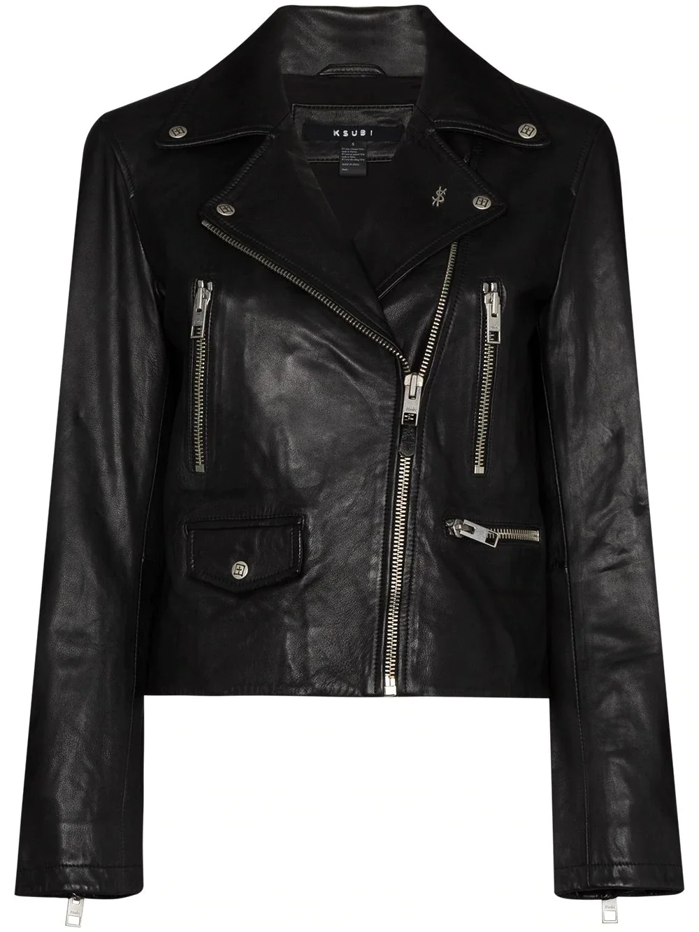 Amplify biker jacket More biker chic than biker chick? Not to worry, with this jacket from Ksubi and its biker-inspired lambskin construction, you'll have everyone fooled. Now, stand next to a Harley Davidson and look like you belong. Highlights - Black - Lambskin blend - Wide notch lapels - Off-centre front zip fastening - Front zip fastening pockets - Long sleeves - Cuff zips Made in Italy Composition Outer: Lamb Skin 100% Lining: Polyester 93%, Elastane 7% SIZE & FIT Model measurements Height 5 ft 11 in(1.8 m) Bust/Chest 31.49 in(80 cm) Hips 36.22 in(92 cm) Waist 25.59 in(65 cm) Measurement SLEEVE LENGTH 23.22 in(59 cm) LENGTH 19.68 in(50 cm) WAIST 33.07 in(84 cm) BUST 34.64 in(88 cm) Shoulder Width 15.74 in(40 cm) FittingInformation This piece fits true to size. We recommend you get your regular size Cut for a slim fit Made with a mid-weight non-stretch fabric Washing instructions Dry Clean Only