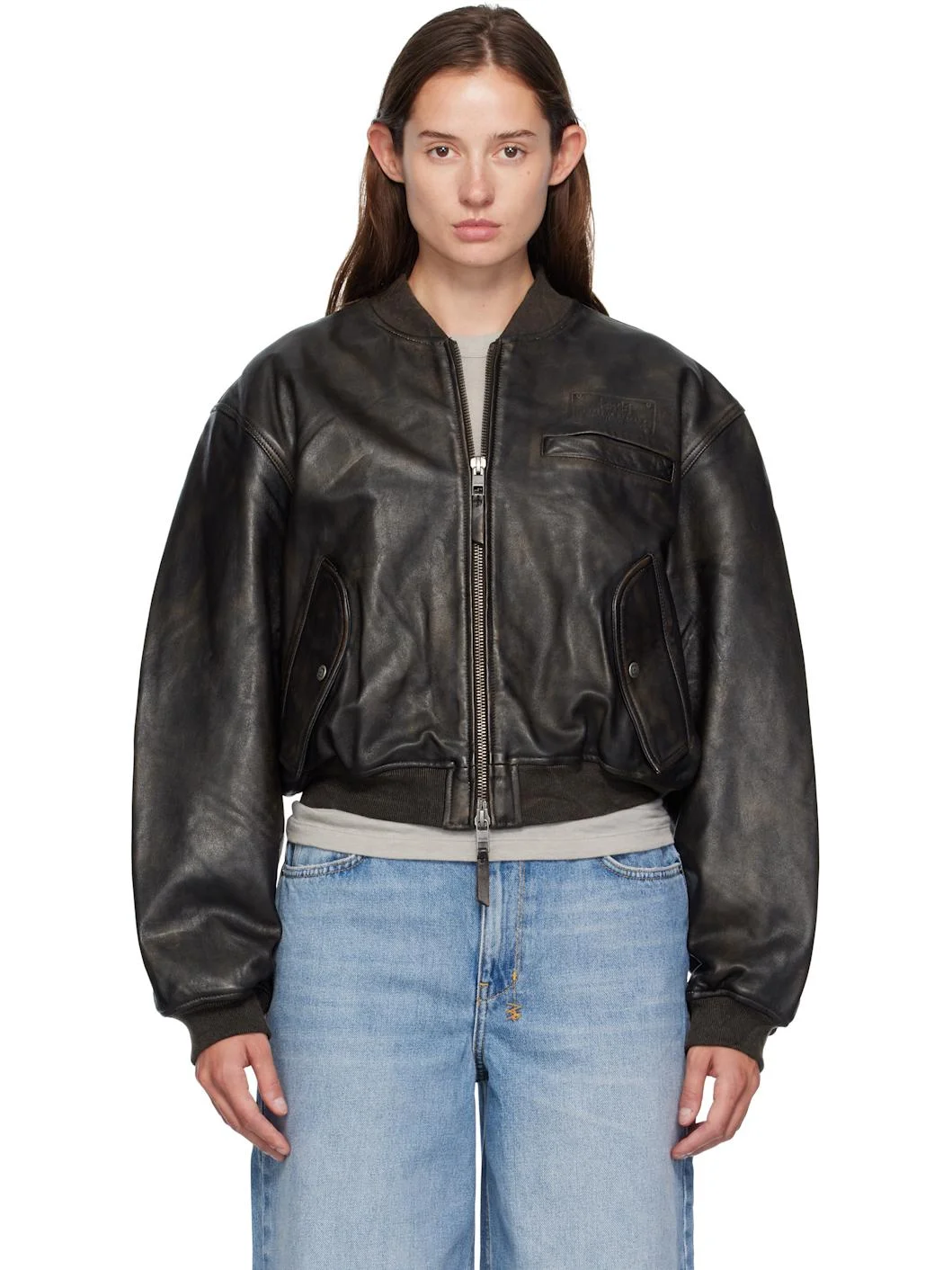 Padded grained lambskin bomber jacket. · Smudging throughout · Rib-knit stand collar, hem, and cuffs · Embossed logo and welt pocket at chest · Flap pockets at waist · Cropped hem · Dropped shoulders · Central seam at back · Full quilted satin lining Supplier color: Black Body: 100% lambskin. Trim: 97% cotton, 3% elastane. Fill: 100% polyester. Lining: 100% polyester. Made in India 252088F064000