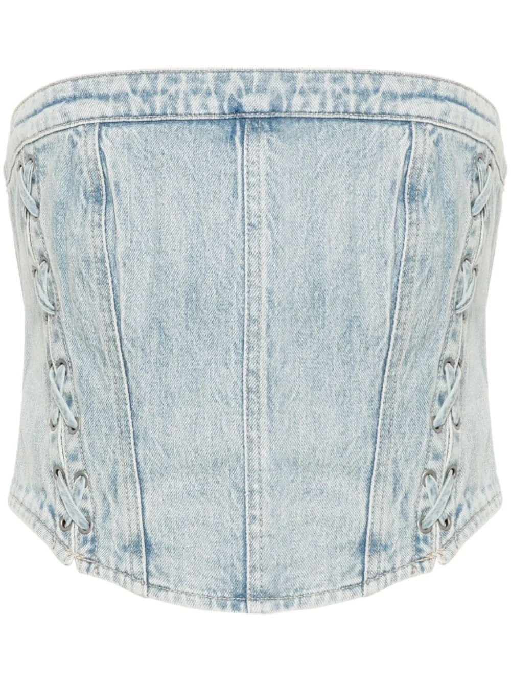 Dove crop top Highlights - Light blue - Cotton blend - Washed denim - Panelled design - Side criss-cross straps - Bandeau style - Embroidered logo to the rear - Strapless - Sleeveless - Rear zip fastening - Cropped - High-low hem - Double layer Imported Composition Cotton 99%, Lycra 1% SIZE & FIT Model measurements Height 5 ft 9 in(1.74 m) Bust/Chest 34.64 in(88 cm) Hips 36.61 in(93 cm) Waist 26.37 in(67 cm) FittingInformation Designed for a close fit throughout Constructed from stretch denim, this piece offers a stretch fit with durability This piece fits true to size – those with a fuller chest may wish to take one size up