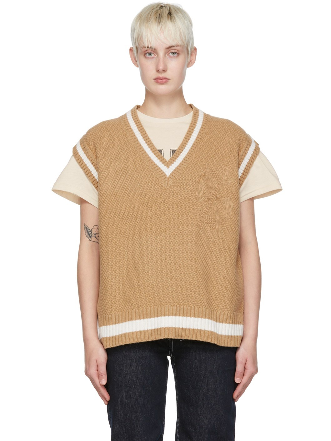Seed stitch knit merino wool and nylon-blend vest. · Logo graphic embroidered at chest · Stripes at V-neck, armscyes, and hem · Rib knit V-neck, armscyes, and hem Supplier color: Tan 80% merino wool, 30% nylon.