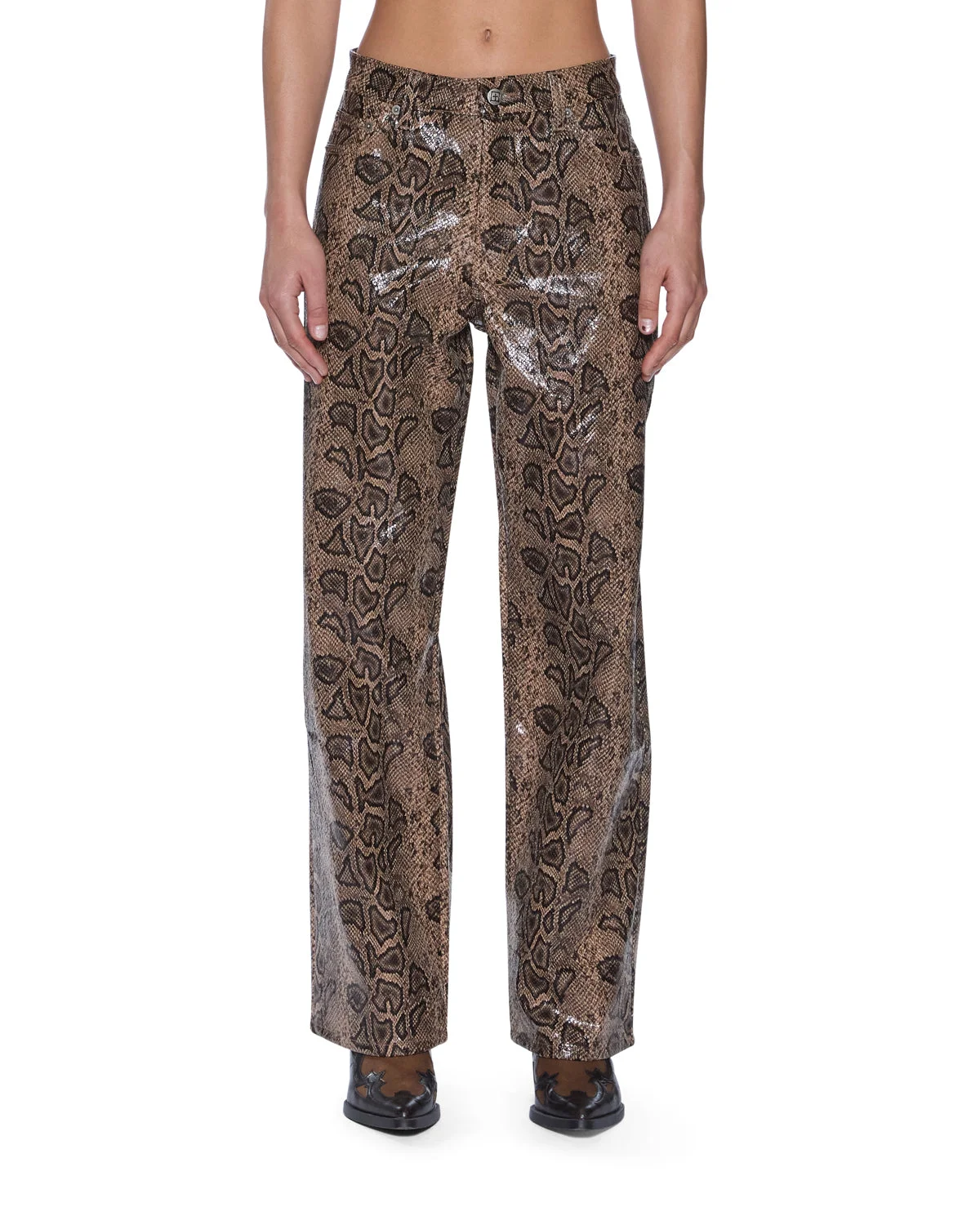 The Empire Pant Snakebite is a relaxed straight-leg style with a true mid-rise and regular-length fit, crafted from printed snakeskin faux leather. Featuring classic five-pocket styling, anti-silver Ksubi branded hardware, T-box and 3x4 embroidery, and a removable pocket tag attached to the wearer's right back pocket. FEATURES, SIZE & FIT - Relaxed straight leg jean - Mid rise - Zip fly - Classic five pocket styling - Regular length - Ksubi t-box stud - 3x4 cross embroidery - Signature woven pocket tag - Branded hardware - No stretch - 100% polyester - Size 26 front rise 29cm / 11 1/2" - Size 26 inleg 79cm / 31" - Size 26 hem circ 50cm / 19 1/2" - WPS26PA005 - Cool gentle machine wash with like colours, dry flat without delay, do not tumble dry, do not wring, do not bleach, cool iron on reverse, do not dry clean