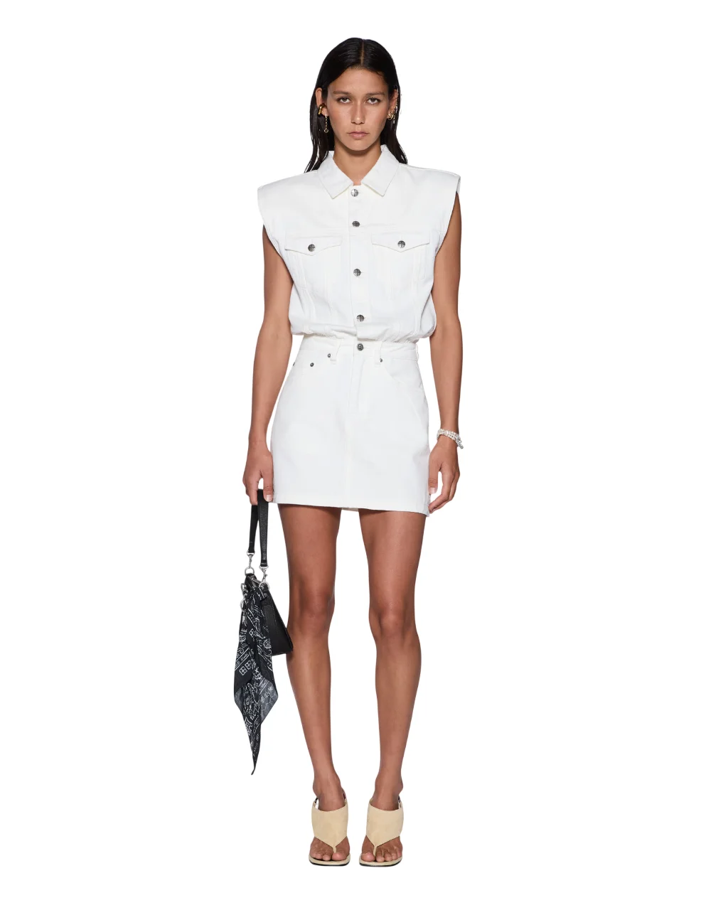 The Form Up Boilerdress Blanc is a sleeveless shirtdress designed with a relaxed blouson bodice and fitted mini-length skirt silhouette. Crafted from premium rigid lightweight white denim, the style features a button-up collar, classic denim panel lines, encased shoulder pads for a strong structured shape, trucker-inspired panelling, and is finished with anti-silver Ksubi branded hardware, 3x4 and T-box embroidery. FEATURES, SIZE & FIT - Trucker style boiler dress - Mini length - Sleeveless - Shank button closure at center front - Fly front - Shoulder pads - Front pocket flaps - Classic five-style pocketing on skirt - Adjustable tabs at waist - T-box branding - Branded hardware - No stretch - 100% cotton - Model is wearing a size 26/S, height 179cm/5'9", bust 76cm, waist 61cm, hip 94cm - Care: Cool machine wash with like colours, wash inside out, do not bleach, remove promptly after wash, do not tumble dry, cool iron on reverse, do not iron directly onto prints or metal hardware, colour may transfer onto other garments and upholstery