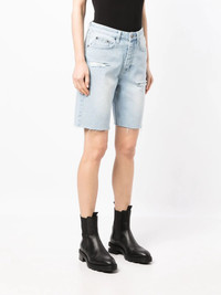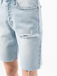 longline distressed denim shorts blue cotton distressed finish knee-length front button and zip fastening belt loops Imported Composition Cotton 100% SIZE & FIT Model measurements Height 5 ft 10 in(1.77 m) Bust/Chest 31.49 in(80 cm) Hips 34.64 in(88 cm) Waist 23.62 in(60 cm) FittingInformation This piece fits true to size. We recommend you get your regular size Designed to be fitted at the waist, loose over the leg Made with a mid-weight fabric Washing instructions Read Manufacturer Guidelines