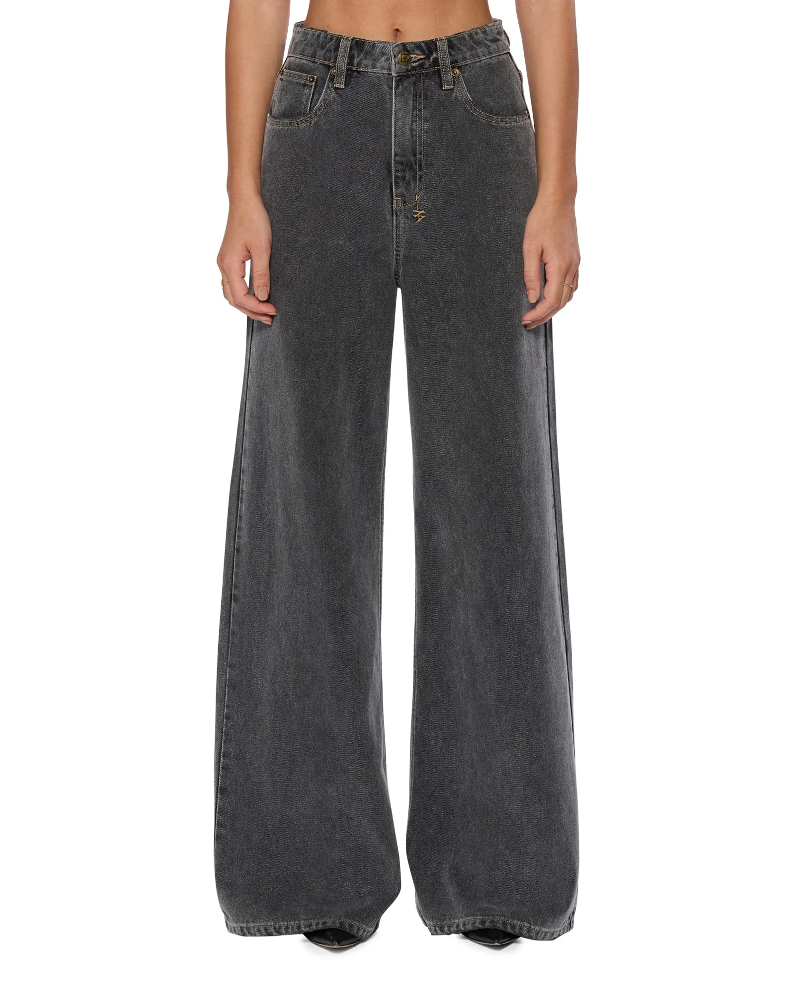 The Strider Cinder is a wide-leg, full-length jean with a super high-rise for a flattering silhouette. Made from premium black stonewashed denim with tobacco topstitching, it features subtle grinding at the waistband, pockets, and hem, classic five-pocket styling, anti-brass Ksubi branded hardware, T-box and 3x4 embroidery, and a removable pocket tag attached to the wearer's right back pocket. FEATURES, SIZE & FIT - Wide leg denim jean - Super high rise - Zip fly - Classic five pocket styling - Full length - T-box branding - 3x4 cross embroidery - Signature woven pocket tag - Branded hardware - No stretch - 100% cotton - Size 26 inseam: 85cm / 33 1/2" - Size 26 front rise: 32cm / 12 5/8" - Model is wearing a size 26/S, height 178cm/5'10", bust 80cm, waist 62.5cm, hip 92cm - Machine wash cold, with like colors. Do not tumble dry, do not bleach, cool iron if necessary. - WSP25DJ005