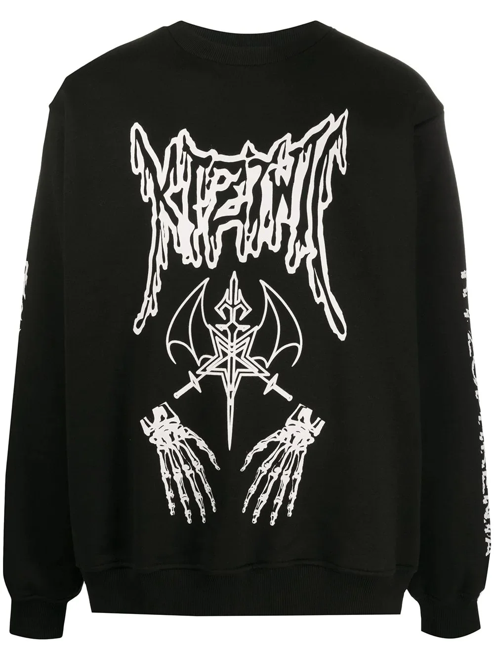 Dead Metal crew neck sweatshirt Black cotton-blend Dead Metal crew neck sweatshirt from KTZ featuring a graphic print, a ribbed crew neck, long sleeves, dropped shoulders and a ribbed hem and cuffs. Imported Composition Polyester 100% SIZE & FIT Model measurements Height 5 ft 10 in(1.79 m) Bust/Chest 31.88 in(81 cm) Hips 35.43 in(90 cm) Waist 23.62 in(60 cm) FittingInformation This piece is unisex. Please take care when selecting your size Cut for a relaxed fit for both men and women Made with a mid-weight fabric