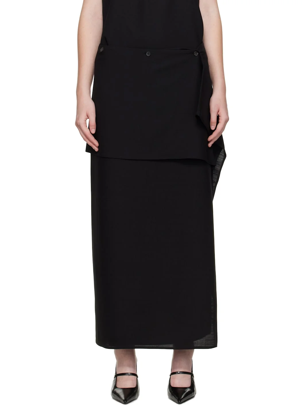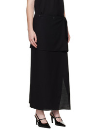 Virgin wool twill maxi skirt. · Wrap construction · Draped panel at waistband · Button fastening at waistband Supplier color: Black 100% virgin wool. Made in Hungary 252190F092001