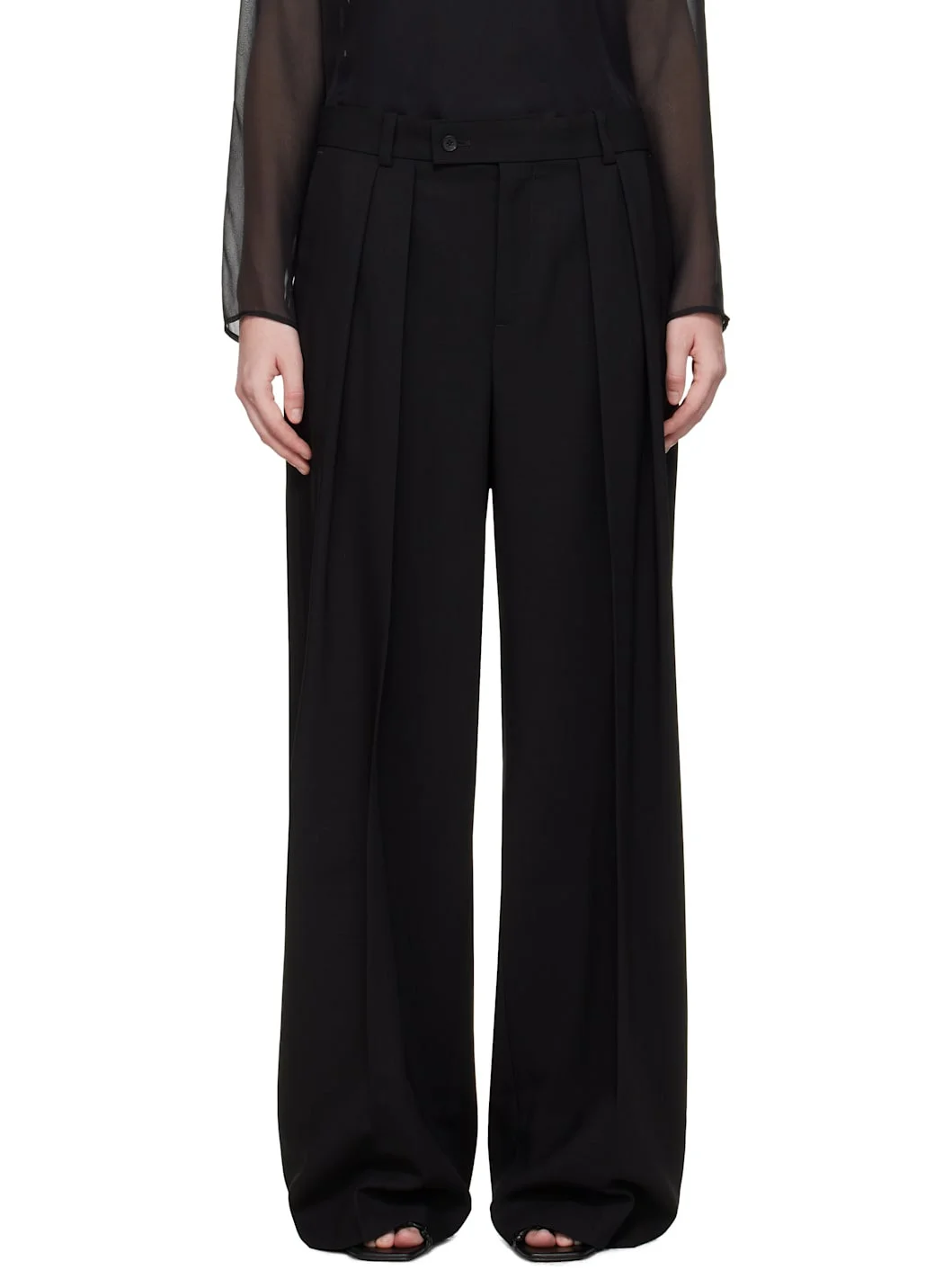Wool twill trousers. · Wide-leg · Mid-to-low rise · Belt loops · Four-pocket styling · Zip fly · Pleats at front · Creased legs Supplier color: Black Body: 100% wool. Trim: 100% silk. Made in Hungary 252190F087000