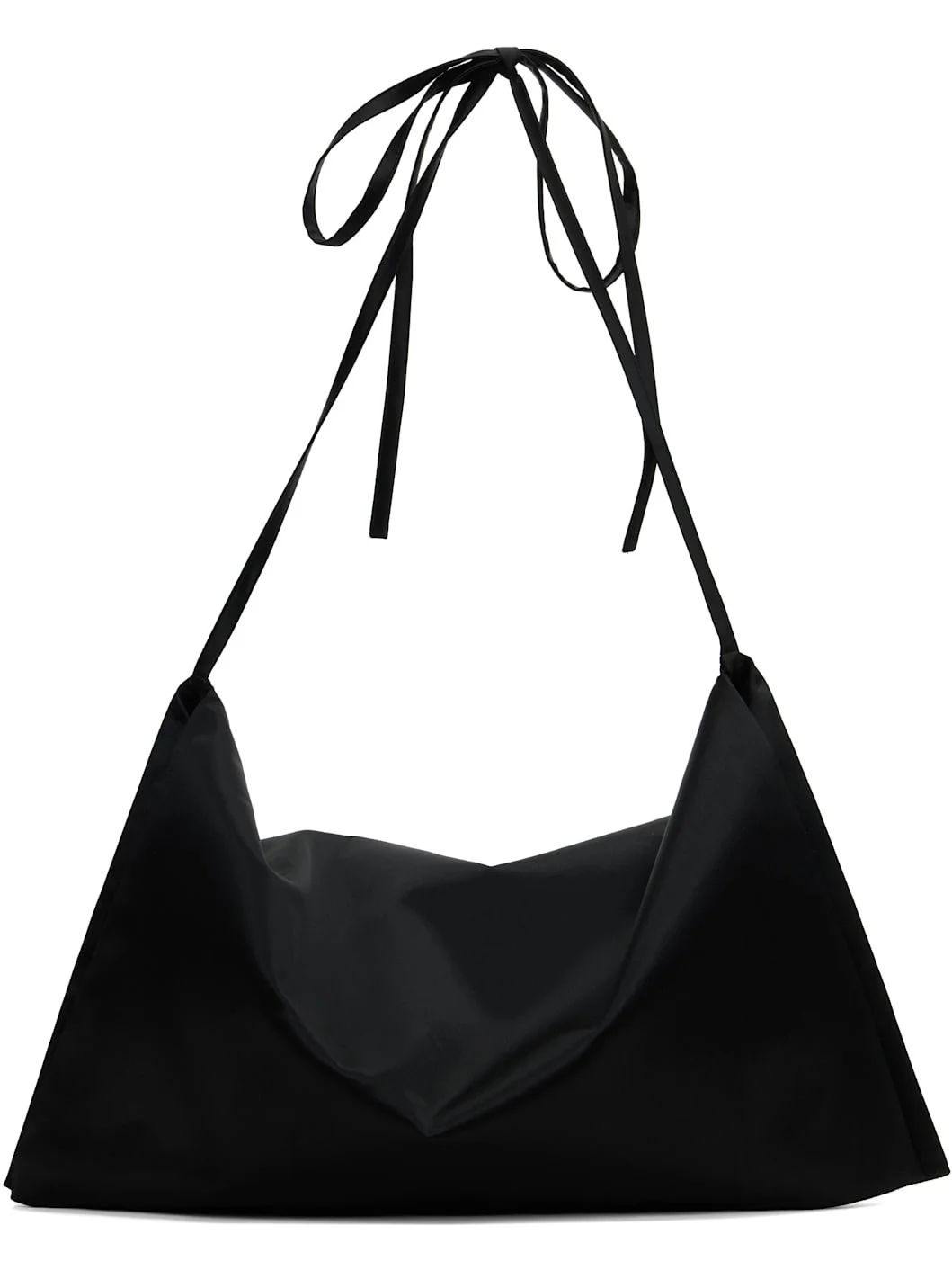 Silk satin shoulder bag. · Foldover construction · Adjustable self-tie crossbody strap · Zip closure · Silk satin lining · H22.5" x W18.5" Supplier color: Black 100% silk. Made in Hungary 252190F048092