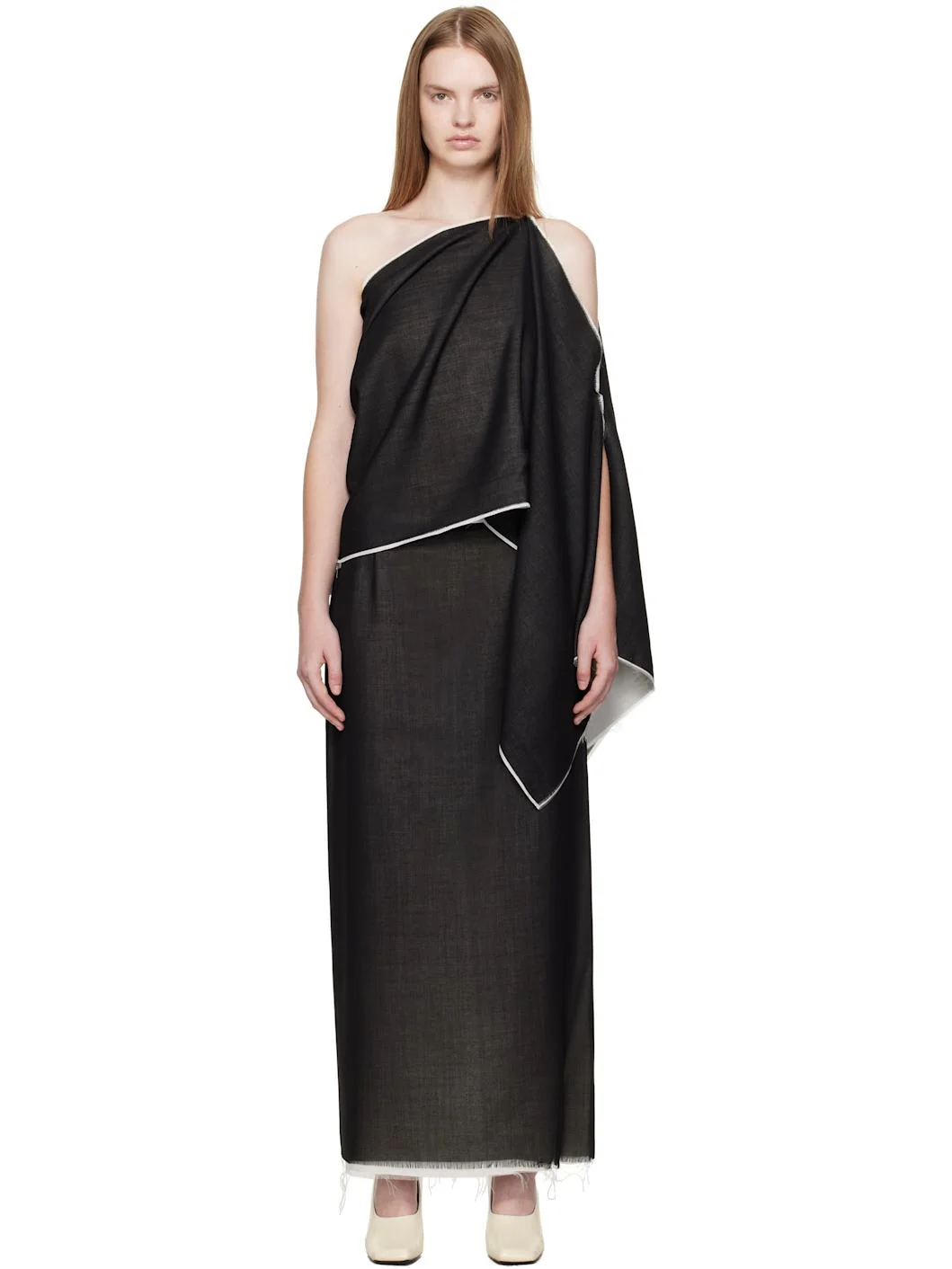 Scarf-style virgin wool crepe top. · Raw edges throughout · Layered and single-shoulder construction · Button fastening at shoulder Supplier color: Black/Off white Body: 100% virgin wool. Lining: 87% virgin wool, 13% silk. Made in Hungary 252190F111004