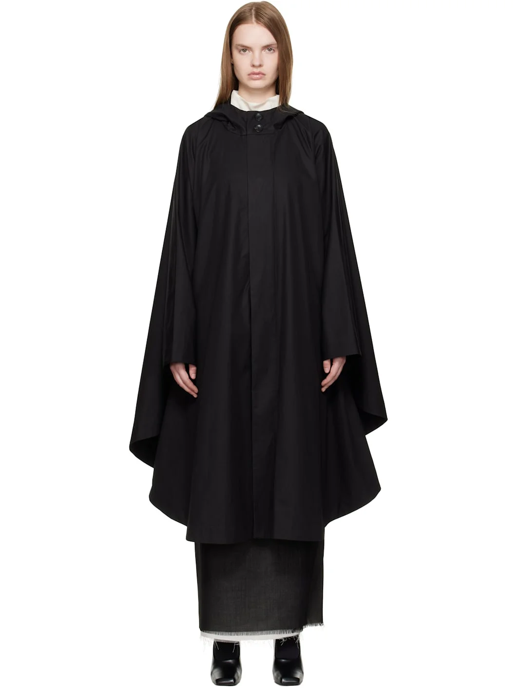 Water-repellent organic cotton gabardine cape-style raincoat. · Stand collar · Concealed button closure · Adjustable button fastening at cuffs · Unlined Supplier color: Black 100% cotton. Made in Hungary 252190F059001