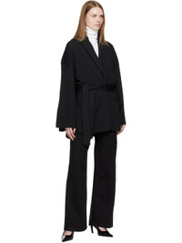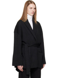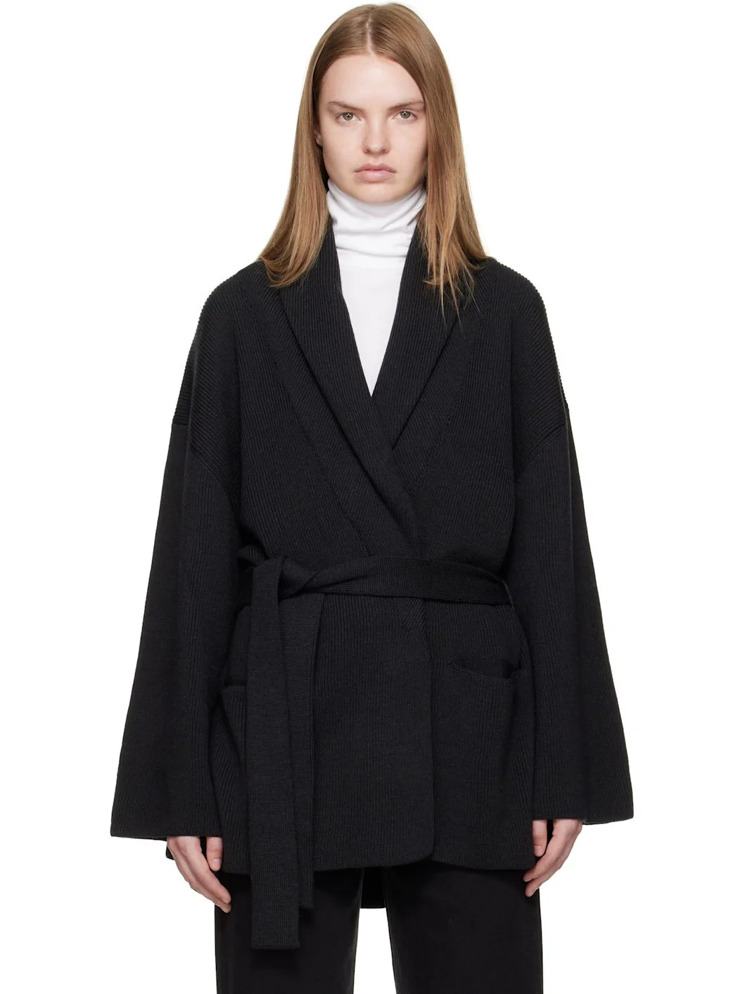Rib-knit virgin wool cardigan. · Shawl lapel · Open front · Belt loops and self-tie belt · Welt pockets at front Supplier color: Dark grey 100% virgin wool. Made in Belgium 252190F095002