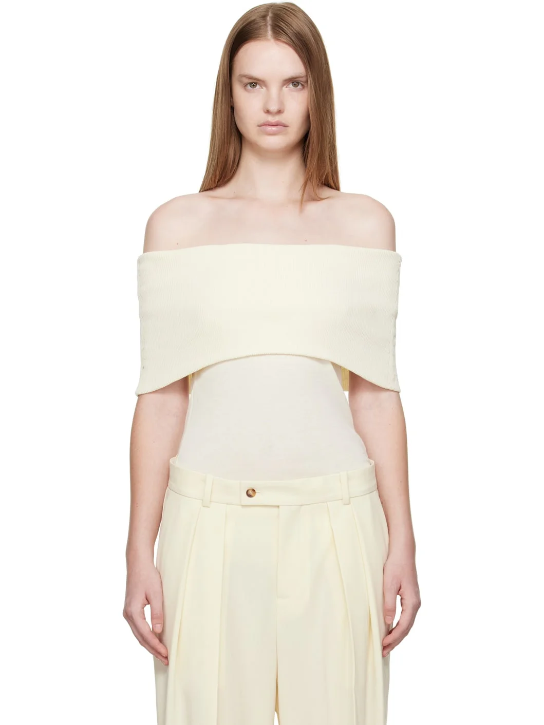 Rib-knit cotton top. · Certified OEKO-TEX® Standard 100 · Off-the-shoulder construction · Foldover neck Supplier color: Off white 100% cotton. Made in Belgium 252190F096006