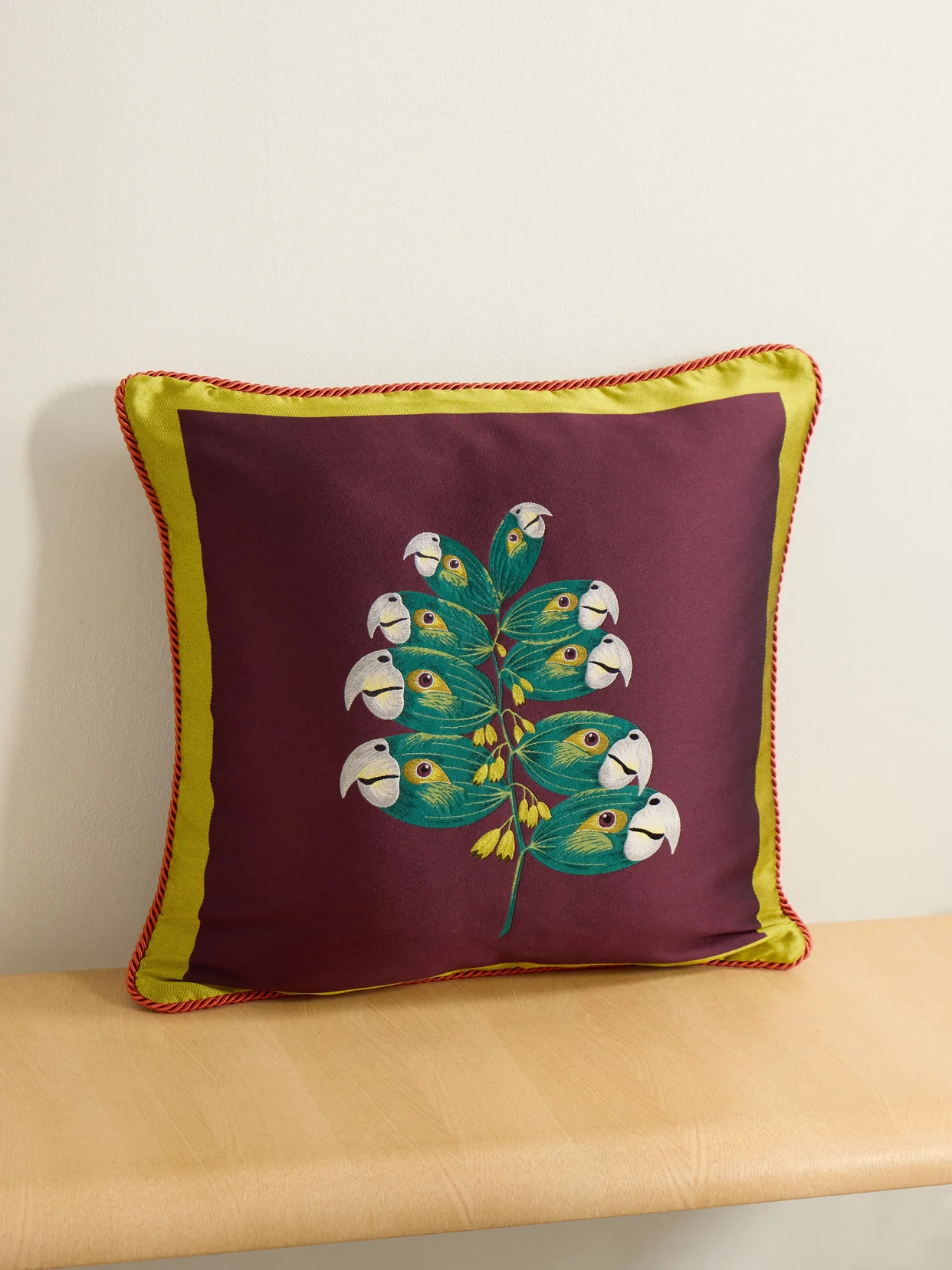 The mesmeric design on La DoubleJ's cushion is a motif by the surrealist artist Beto Val. Rich and sumptuous, it's made from satin-jacquard with cord piping, evoking Italian maximalism at its chicest.