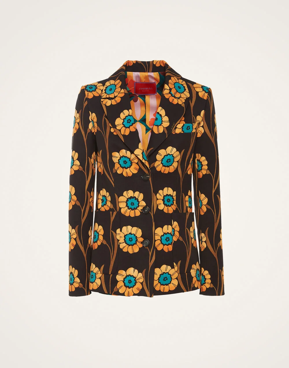 If the next Bond is a woman, she’s wearing this blazer. An updated take on a Seventies silhouette, the 24/7 Jacket has a structured shoulder and slightly tapered waist for a fiercely flattering fit. It’s crafted in smooth and stretchy compact jersey for new levels of comfort and will effortlessly slip over just about anything in your wardrobe in this chic Daisychain on black motif. (Though for next level badassery, feel free to dial things up with the 24/7 Pants to match). Details & Fit - Compact jersey - Structured Shoulder - Large Pockets on the Lapel - Contrast Lining - Faux Horn Buttons - 100% Made in Italy - Composition: 88% Polyester 12% Elastane - The model is 179 cm tall and wears a size S - Garment length: 65cm