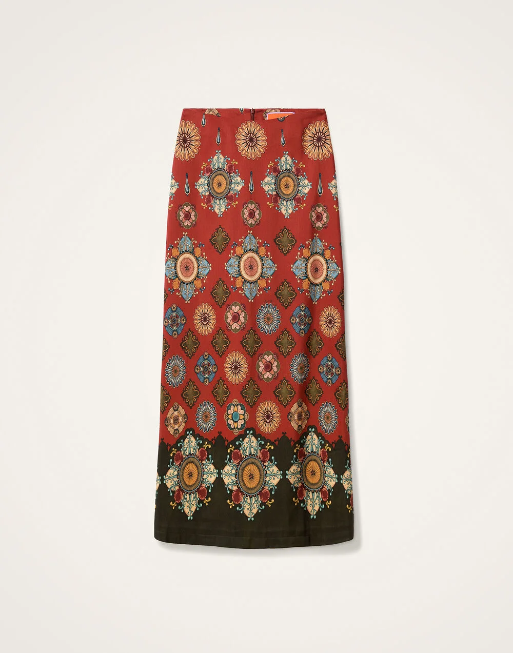 Long and lovely, this super skirt has a mid-rise waist, falling slim on the hips into an A-line shape that swings above the ankle. It’s a winter wonder made in our warm wool cady and this hand-placed Nucleus print which will bring some serious Italiano chic to your nine-to-five and beyond. Try it with our feathered La Scala top for a high drama look for your next fancy night out. Details & Fit - Wool cady - Hand-placed print - Slightly fitted in the waist - Mid rise - Concealed side pockets - Gentle A-line shape - Hits above the ankles - 100% Made in Italy - Composition: 76% Wool 24% Polyamide - The model is 180 cm / 5′ 11″ tall and wears a size S