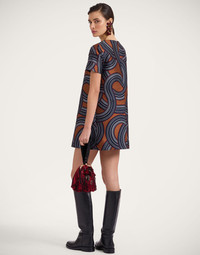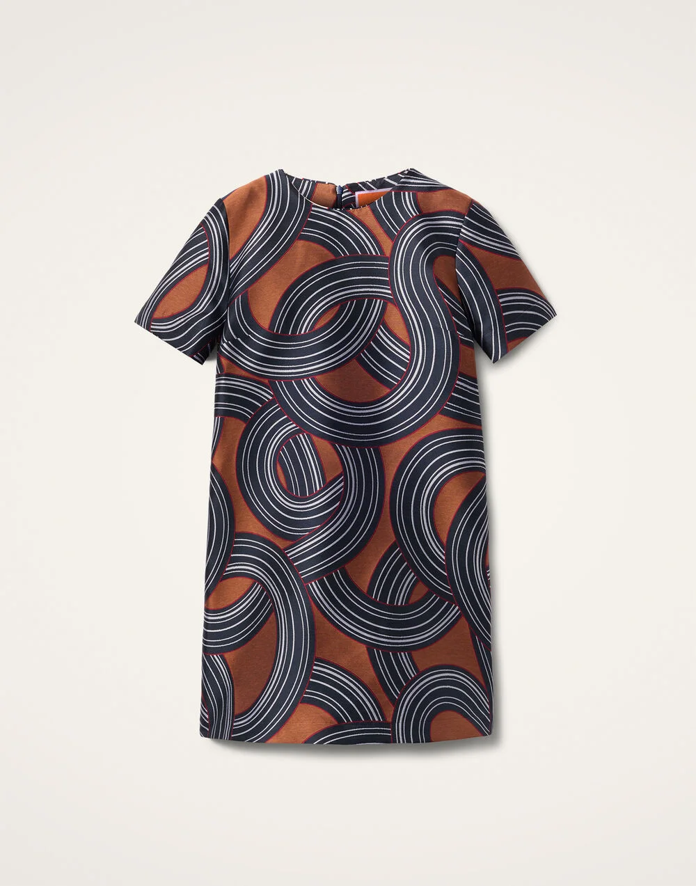 Take our signature Swing Dress, give it a generous chop and voila! You’ve got the Mini Swing. The shorter version of this easy T-shirt silhouette falls around mid-thigh, perfect for La DoubleJ’s more petite fans or for showing off your legendary legs. Made in our sumptuous jacquard, it works as well for day (with a pair of tights) as it does for night (polished pins and heels all the way). Details & Fit - Shimmery jacquard - Slim in the shoulders, generous in the hips - Classic T-shirt silhouette - Falls into an A-line - Mini length - Hidden side slit pockets - Concealed back zipper - 100% Made in Italy - Composition: 57% Polyester 33% Recycled Polyester 10% Viscose - The model is 180 cm / 5′ 11″ tall and wears a size S