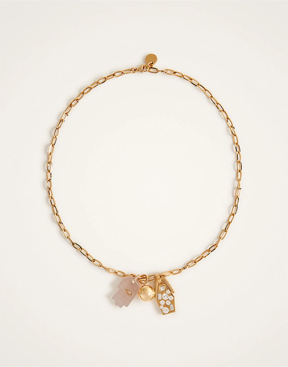 A charm necklace that raises your vibration? Sign us up, sister! With a 24K gold coated chain and bell charm, this necklace arrives with extra energy elevating with our crystal embellished Portal charm and a Hamsa hand in love and compassion-enhancing rose quartz. Gorgeous layered with other items from the La DoubleJ jewelry collection, this makes for a beautiful gift to someone you love. Details & Fit - 3-charmed necklace - 24K Gold Plated Brass and Rose Quartz - Adjustable Dainty Chain - Composition: 70% Brass 15% Crystal 15% Pink Quartz - Made in Italy