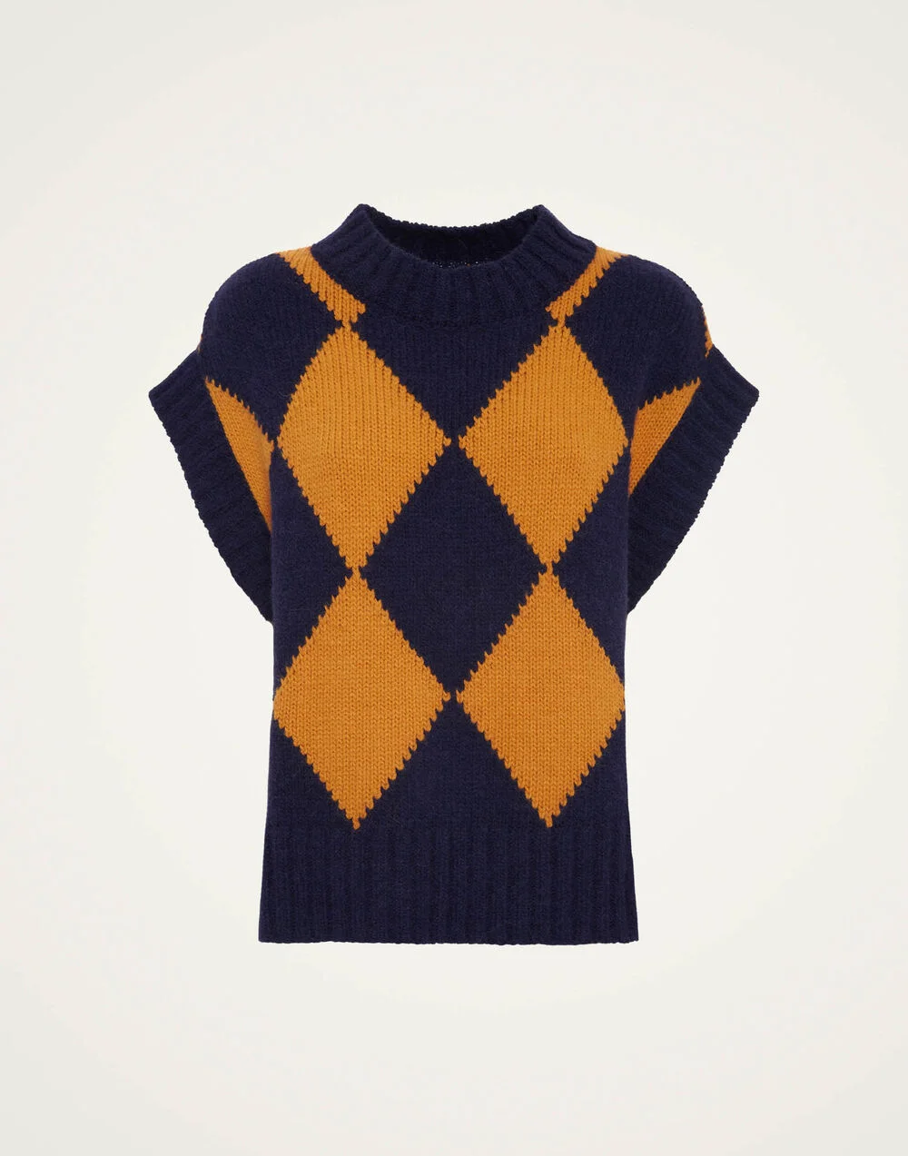 What statement sweater feels better than one crafted from soft boucle wool? Our Argyle Gilet is made in Italy from a texture-fest alpaca wool blend and is designed to bring high vibes to winter wardrobes in these vibrant happy hues. With a mock neck and slits on the hips, it’s a stylist's dream with its mannish oversized fit that brings plenty of swag to pretty print dresses or black turtlenecks alike. Details & Fit - Oversized square shape - Mock neck - Two slits on hip - 100% Made in Italy - Composition: 48% Alpaca Superfine 36% Polyacrylic 9% Polyamide 7% Polyester - The model is 181 cm tall and wears a size S - Garment length: 57cm