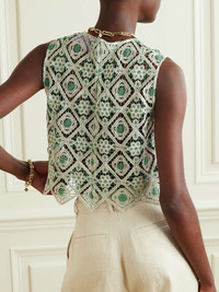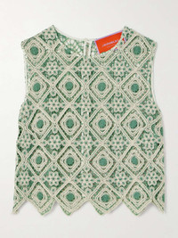 EDITORS'NOTES La DoubleJ describes this 'Aria' tank as a "song in a shirt." It's macraméd from jade and cream yarns in a floral grid pattern and finished with a zigzag, cropped hem. Underpin yours with a tonal bralette and coordinate with the matching pants. SIZE & FIT Model measurements: - Fits true to size, take your normal size - Designed for a slightly loose fit - Cropped length - Lightweight, non-stretchy fabric - Model is 175cm/ 5'9" and is wearing a size Small - Bust: 79cm/ 31” - Waist: 64cm/ 25” - Hip: 92cm/ 36" DETAILS & CARE - Jade and cream macramé - Button fastening keyhole at back - 100% polyester - Hand wash