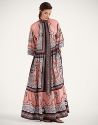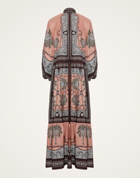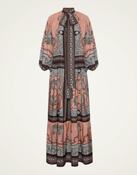 Named after the powerful Ancient Greek Goddess of war, the dramatic Athena Dress will enchant all in your aura. Designed with fiercely feminine details like bouncy sleeves and a foulard at the neck, this modern evening gown is crafted in voluminous swathes of exquisite silk voile, which has a sheer, wispy quality to keep things elegant and light. Its floor-length silhouette is the perfect canvas for our majestic Mirage motif hand placed in Italy by the most kick-ass artisan hands. Details & Fit - Silk voile - Hand-placed print - Full length - Two tiered skirt - Voluminous - Sleeves secured with elastic cuff - V neckline with sash that can wrap around neck - No pockets - No zip - 100% Made in Italy - Composition: 100% Silk - The model is 180 cm / 5′ 11″ tall and wears a size S