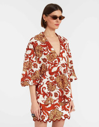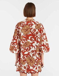 Oversized but elegant, intricate but effortless, the Jackie Top is everything you want in a sophisticated summer shirt. With a high-low hem and roomy back, she’s a throw on a glow kind of top, crafted either in our powerful printed lace, light cotton poplin or elevated evil eye macrame. A little sheer, she can still be worn braless without leaving you super exposed, and is long enough to cover your bathing suit and chic enough for a night out in Portofino. Details & Fit - Printed lace - Long sleeved top - Slightly Oversized - Slightly sheer - Hits below bum - V neck - Voluminous sleeves with elasticated cuff - Made in Italy - Composition:100% cotton - The model is 177 cm tall and wears a size S - Garment length: 68cm