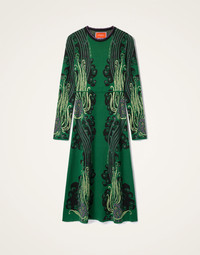 The Bee Dress goes all-in for jacquard! Featuring contrast patterned Lurex-flecked Italian compact wool, this form-flattering, party-ready number has a fitted bodice, round neck and an A-line skirt that hits mid-calf. Details & Fit - Italian-made lurex jacquard blend - Fitted bodice - A-line skirt - Round collar - Contrast jacquard patterns - Composition: 49% Viscose 40% Wool 7% Metal Polyester 2% Polyester 2% Polyamide - Made in Italy - The model is 177 cm tall and wears a size S