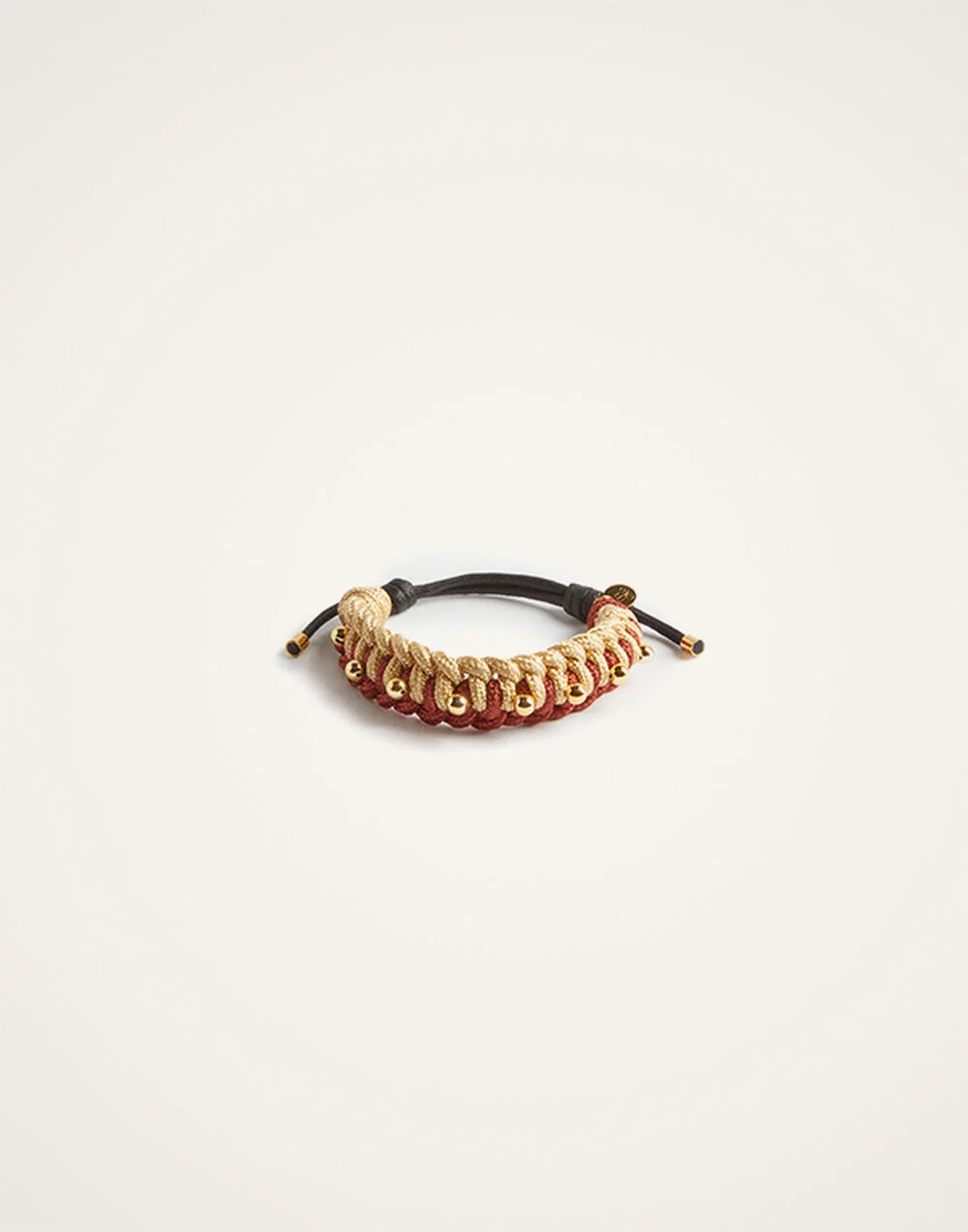 She's the sophisticated big sister to your childhood friendship bracelets. Intricately embroidered braids intertwined by Italian artisans delivered in a rainbow of two-tone combos. Buy in bulk and share them with your girl gang or stack them for a colorful textured cuff effect. Details & Fit - Braided bracelet with golden studs detail - Adjustable slider fastening - Composition: 35% Acrylic 30% Acetate 25% Cotton 5% PMMA 5% Brass - Made in Italy