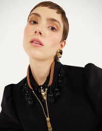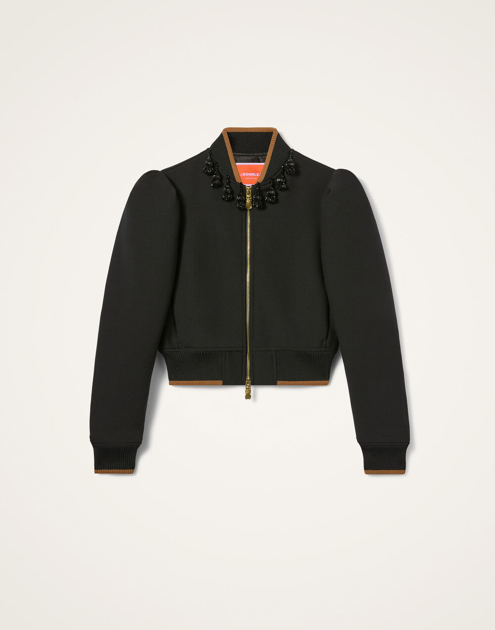 The best-selling Bon Bon Bomber is back, bella! The ideal outfit elevator no matter the scenario, this embroidered Italian wool beauty in solid black is perfect for layering over your printe New Year's Eve Party piece. Details & Fit - Regular Fit - Wool - Cropped bomber - Zip in front - Slim body - Embroidered collar - Ruched sleeves - Ribbed cuff and collar - Composition: 95% Virgin Wool 5% Polyamide - Made in Italy - The model is 176 cm / 5′ 9″ tall and wears a size S
