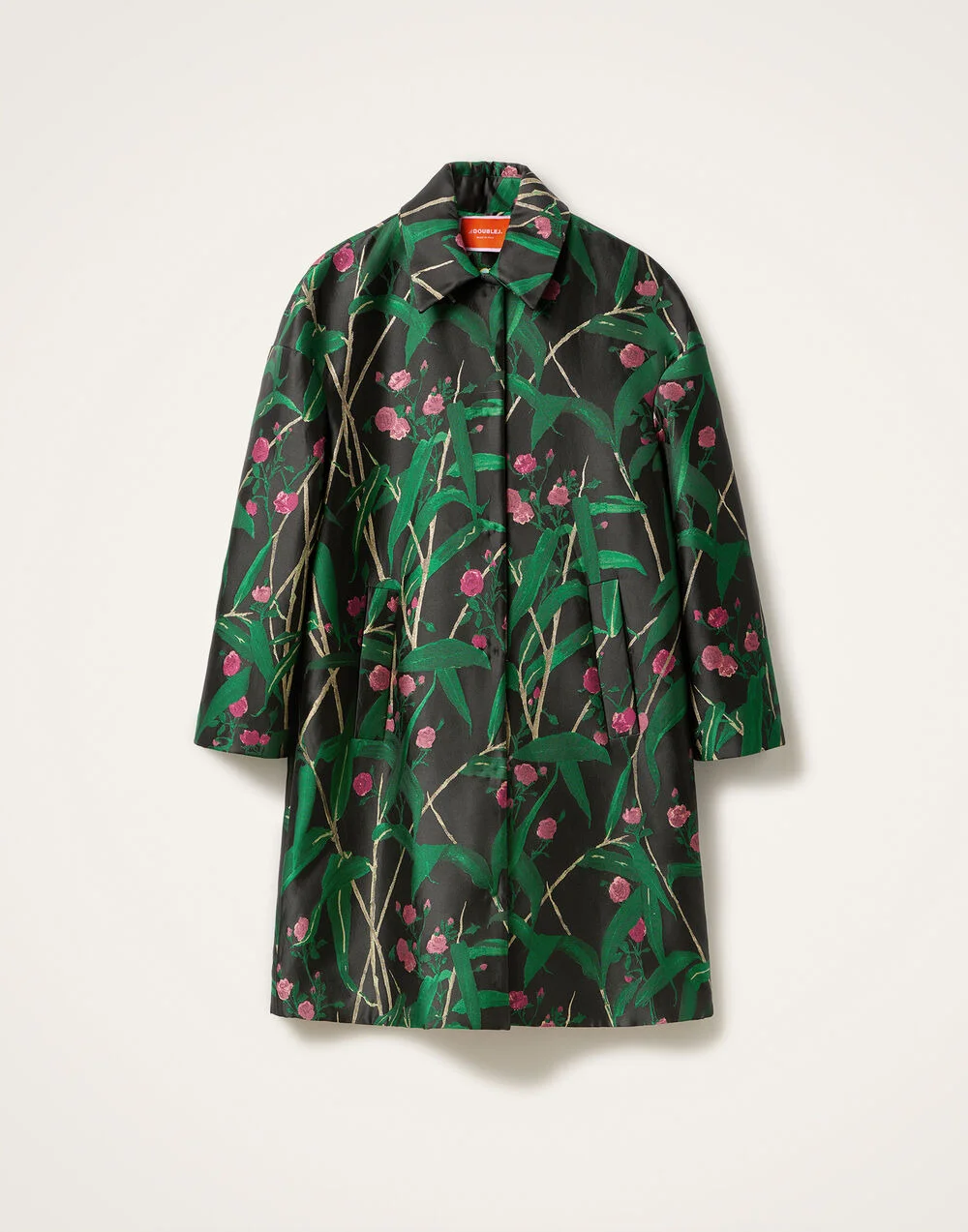 A coat so opulent no-one will care what you’ve got on underneath. Featuring a rounded collar, side pockets and generous swing-cut hemline, it sits perfectly over all your cold-weather clothes - even the bulkiest of sweaters are no match. Shimmering in our Bamboo jacquard woven with silk and metal threads, this beauty makes a statement whether you’re heading for coffee or the red carpet. Make it a stunning full look with the matching Hendrix Pants either way. Details & Fit - Jacquard - Round collar - Fitted in the shoulders and arms - Button-up front - Side pockets - Oversized cut - 100% Made in Italy - Composition: 50% Polyester 25% Silk 19% Viscose 5% Metal Polyester - Garment length: 106cm - The model is 177 cm / 5′ 9.7″ tall and wears a size S