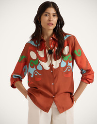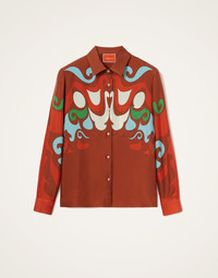 This classic, straight-cut button down silk shirt is timeless and goes with virtually anything in your wardrobe. The fit is straight and feminine with slightly gathered sleeves that hit at the wrist, which brings tons of easy elegance for work, weekends, and just about everywhere else. Finished with our hand-placed Phoenix print to raise your vibration. Details & Fit - Silk twill - Loose fit - Placed print - Silk covered buttons down front and on cuffs - Back box pleat - Curved bottom hem - Garment length: 66cm - 100% Made in Italy - Composition: 100% Silk - The model is 178 cm / 5′ 10″ tall and wears a size S