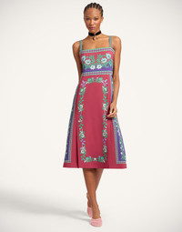 Mamma Mia, does this midi deliver the dazzle! The Buy Me A Martini Dress hits just below the knee, with skinny straps for showing off those shoulders. A corset style top and three panelled skirt creates an alluring hourglass shape, made even more bewitching in this Regalia motif placed by hand. Pair it with our Ballerina Flats in the day and a Weekend Wedge in the evening for day-to-night decadence. Details & Fit - Fitted Silhouette - Envers satin - Placed Print - Slim straps - Corset style top - Three panelled skirt - Composition: 96% Viscose 4% Elastane - Made in Italy - Garment length: 120cm