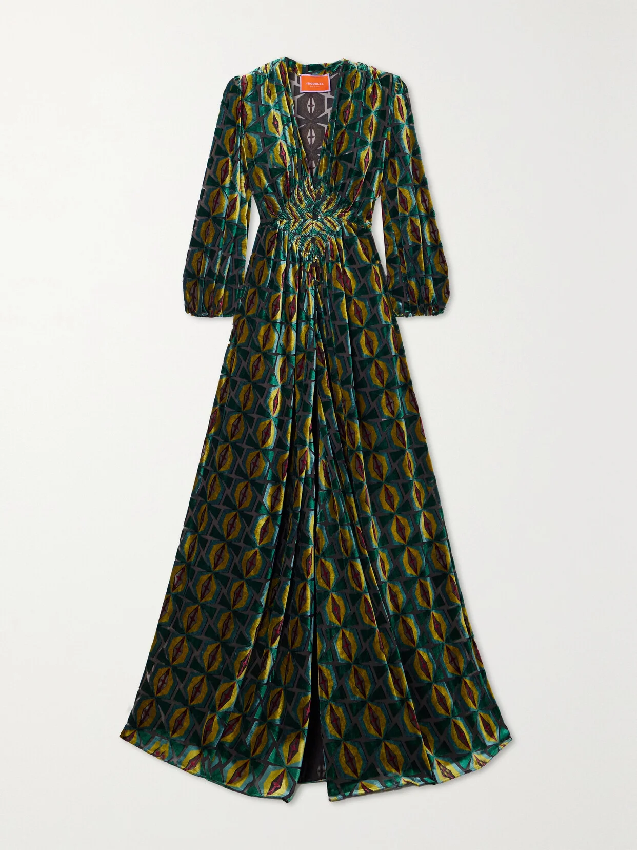 La DoubleJ's 'Camerino' dress is made from plush devore-velvet and printed with a geometric pattern in rich jewel tones. It has a plunging neckline, a smocked waist and cropped blouson sleeves that evoke silhouettes from the '40s. Style yours with a row of cocktail rings.