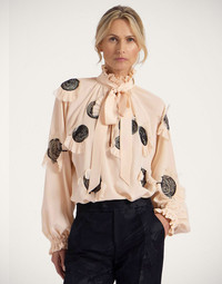There’s nothing like a little romance to zhuzh up your wardrobe separates. Light, beautiful and unapologetically feminine, the Cerere Blouse enraptures in this glorious Italian silk. Its vintage-inspired shape appeals to our whimsy side and is finished with a detachable foulard at the collar that can be tied, styled as a belt or let loose. Details & Fit - crepe de chine - Detachable neck sash secured with loops - V neck - Puff sleeves - 100% Made in Italy - Composition: 100% Silk - The model is 178 cm / 5′ 10″ tall and wears a size S